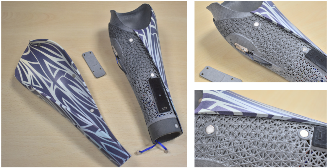 A final demonstrator of the forearm socket is produced in PA12, manufactured with the MJF process, and a cover in same material is applied. Specific features are applied to allow sensorization and cabling, and also to insert small permanent magnets for the cover.
