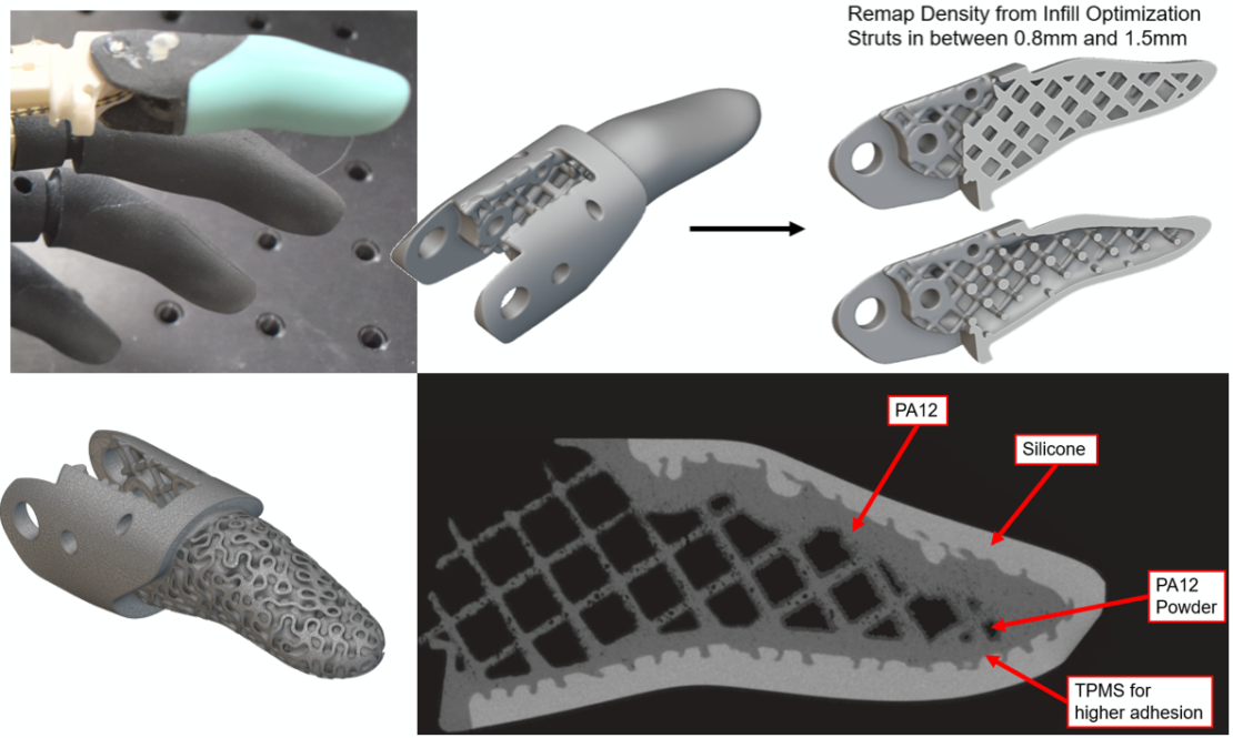 The final PA12 fingertip design features an optimized geometry that includes both the external shell and internal structural elements. Within this configuration, a TPMS Gyroid interfacial lattice is integrated into the fingertip to create a porous interface, specifically designed to promote mechanical interlocking between the PA12 structure and the silicone layer. Computed tomography (CT) analysis of the resulting prototype confirms the effectiveness of this approach, showing the internal cross section of the fingertip with the embedded Gyroid lattice and demonstrating complete silicone infiltration throughout the porous interface.