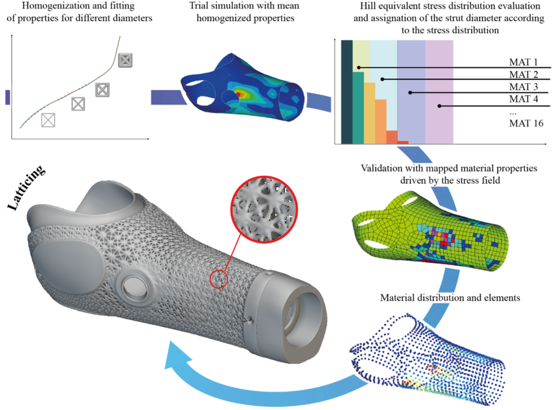 A field-driven optimization workflow is adopted for the prosthetic socket of Lattice structure. Finite element analysis of the homogenized socket shell is first performed to obtain the spatial distribution of equivalent stress. This distribution is then discretized into stress intervals and mapped to corresponding sets of homogenized material properties. Based on this mapping, a stress-to-diameter relationship is derived and used to assign locally varying lattice strut sizes, ultimately resulting in an optimized lattice-based socket geometry.