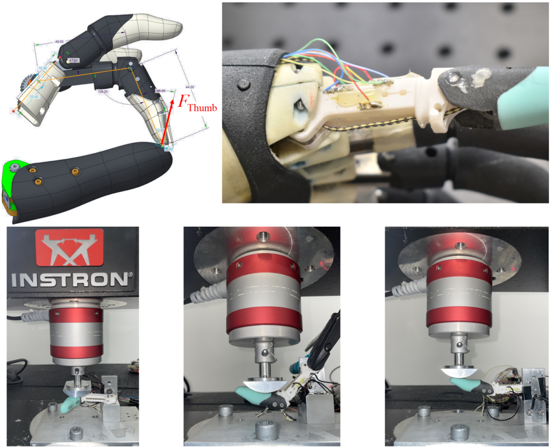 A strain gage configuration is applied to the proximal phalanx for load sensorization of the finger as evident in the demonstrator produced. Once the optimal sensor configuration is identified, the structural design of the proximal phalanx is refined through geometric modifications inspired by load cell design principles. Cavities are primarily introduced to filter the mechanical actions transmitted to the sensing region and to promote a predominantly uniaxial strain state. The sensorized finger is then tested under representative grasping conditions: lateral grasp configuration, pinch/power grasp configuration, extended finger with load applied at the fingertip.